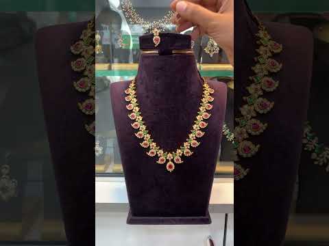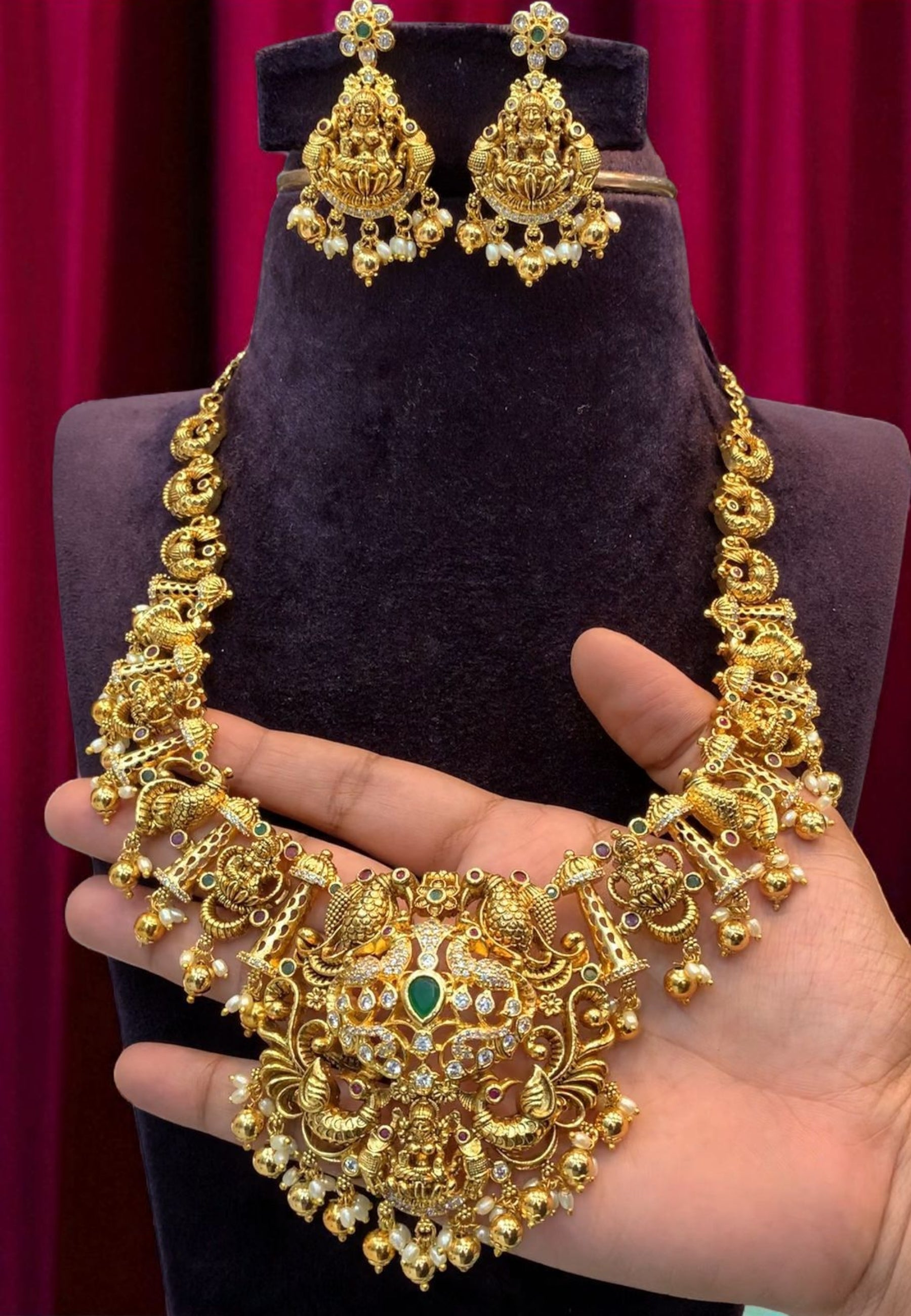 Beautiful three layer long haram with ruby stone and Laxmi Devi motive