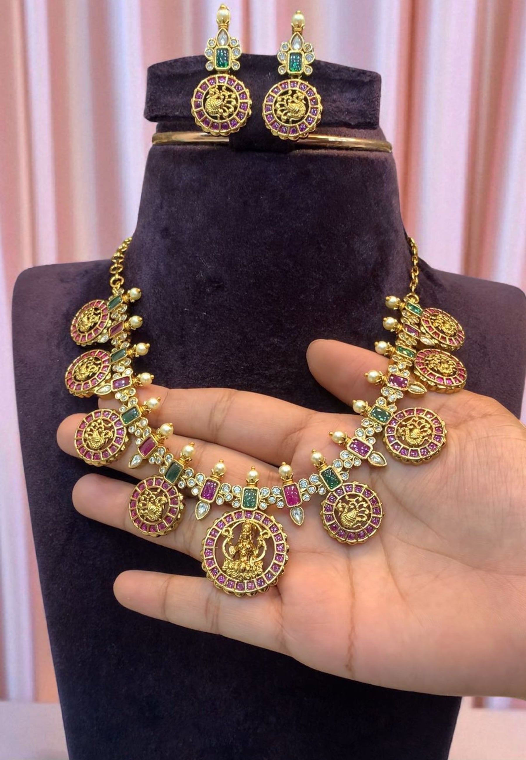 Beautiful short necklace with god Laxmi Devi motive and green beads