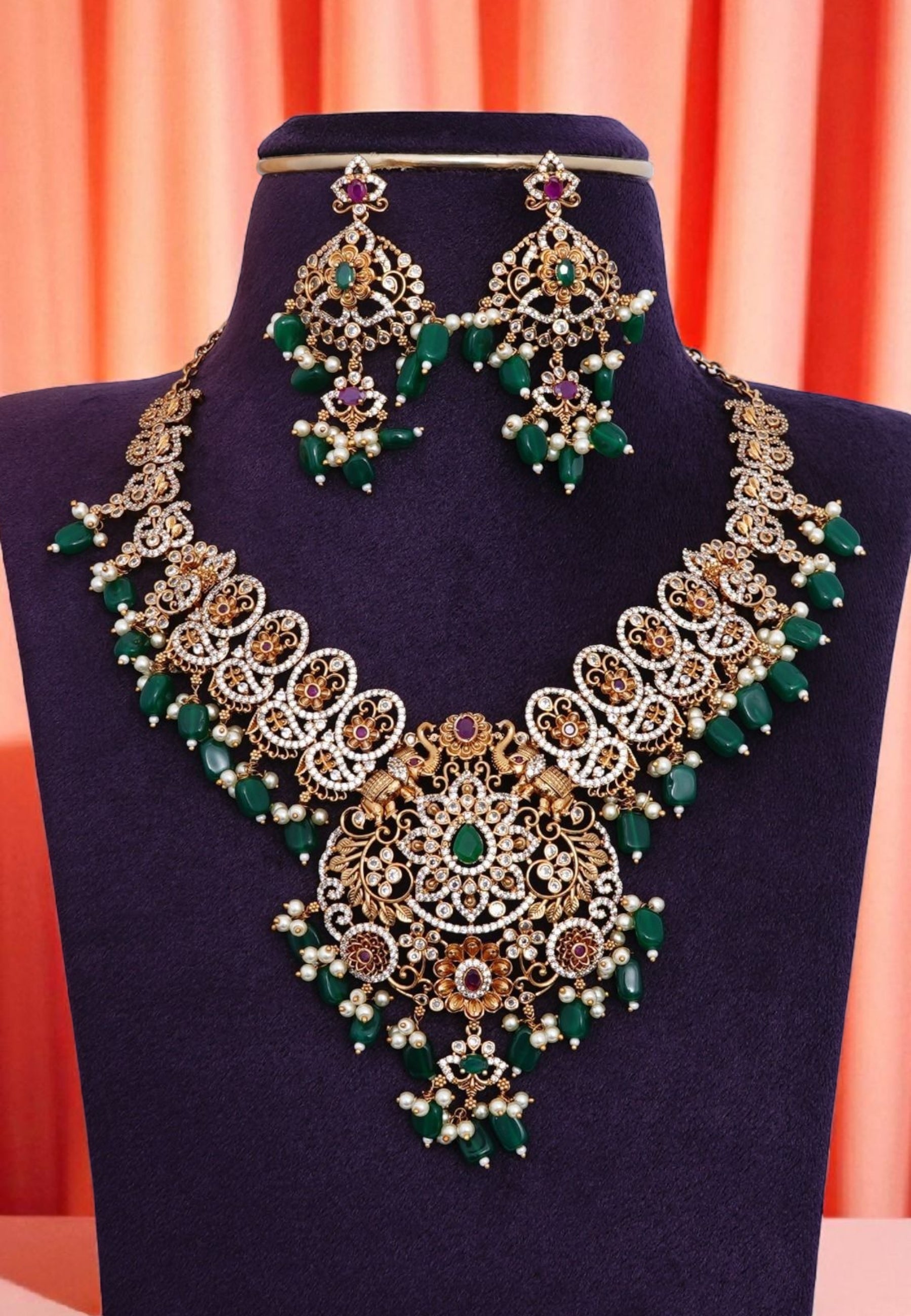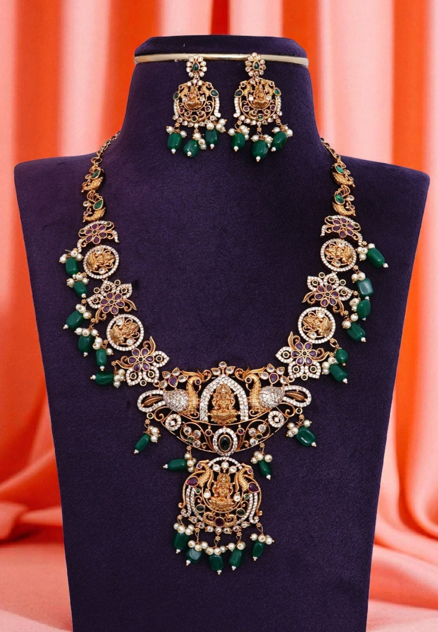 Beautiful short necklace with green beads and god Laxmi Devi motive