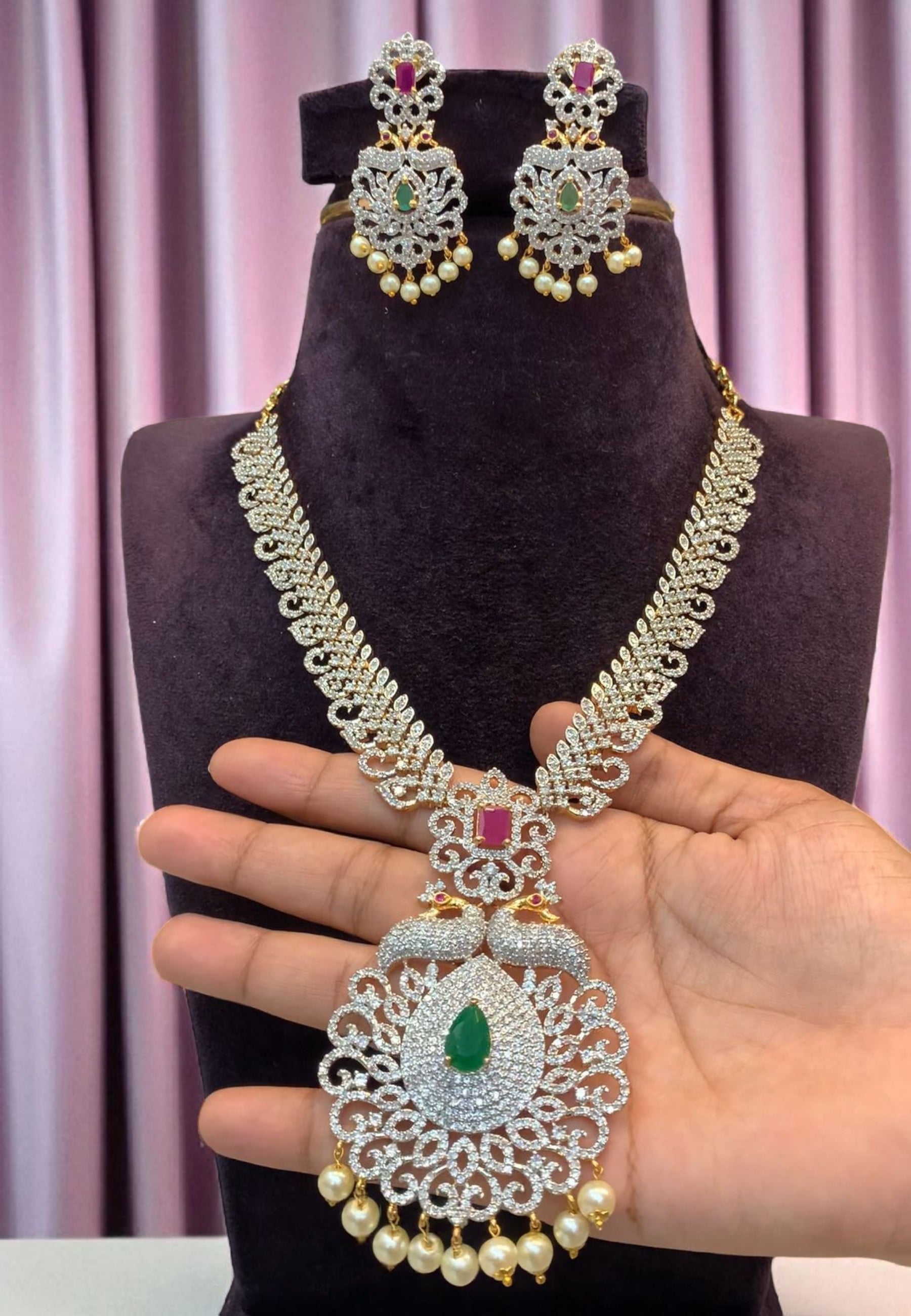 Traditional long nakshi haram with Laxmi Devi motive pendant and green beads