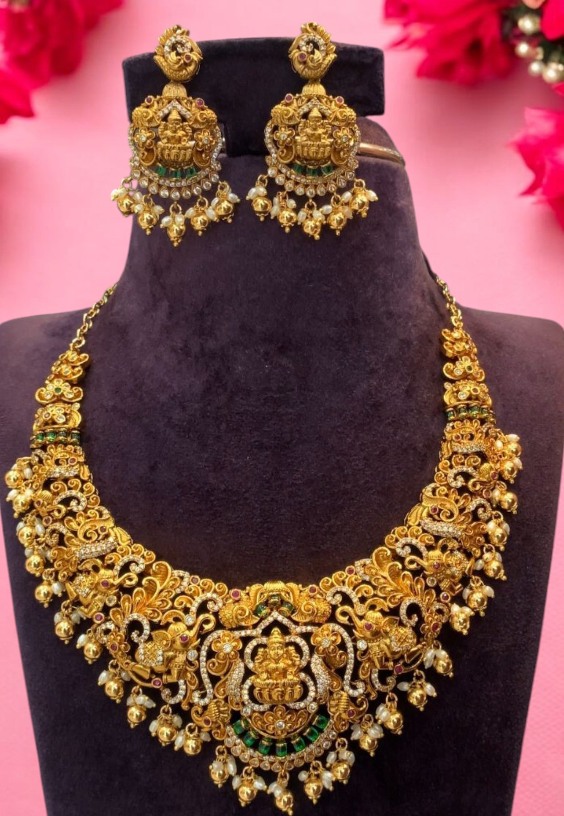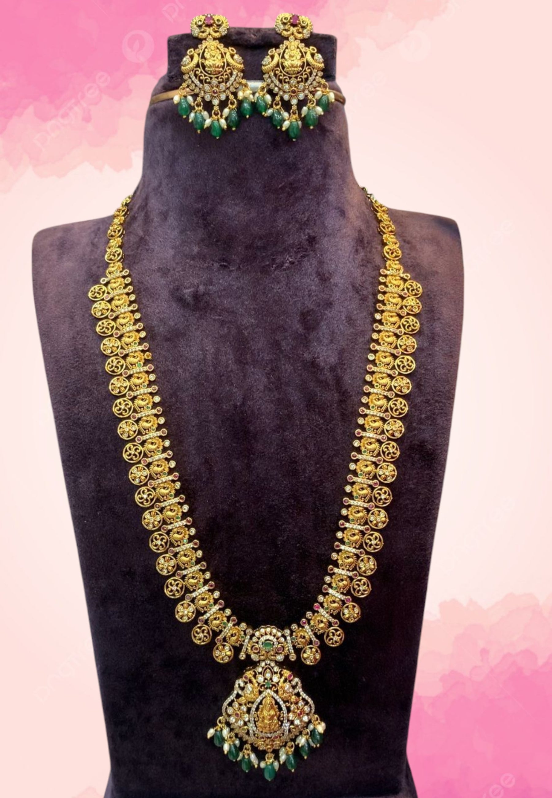 Beautiful nakshi long haram with god Laxmi Devi motive and guttapusalu hangings