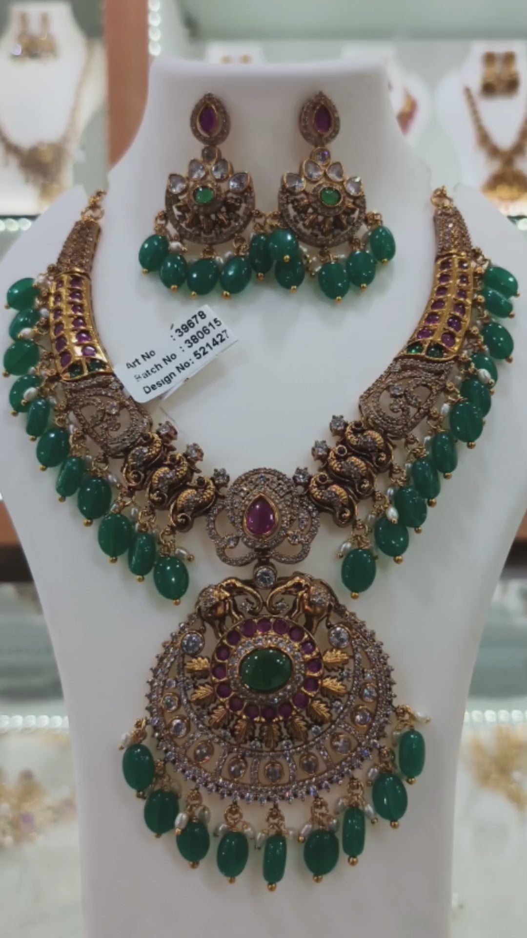 Traditional 3d short necklace with green stone and guttapusalu hangings