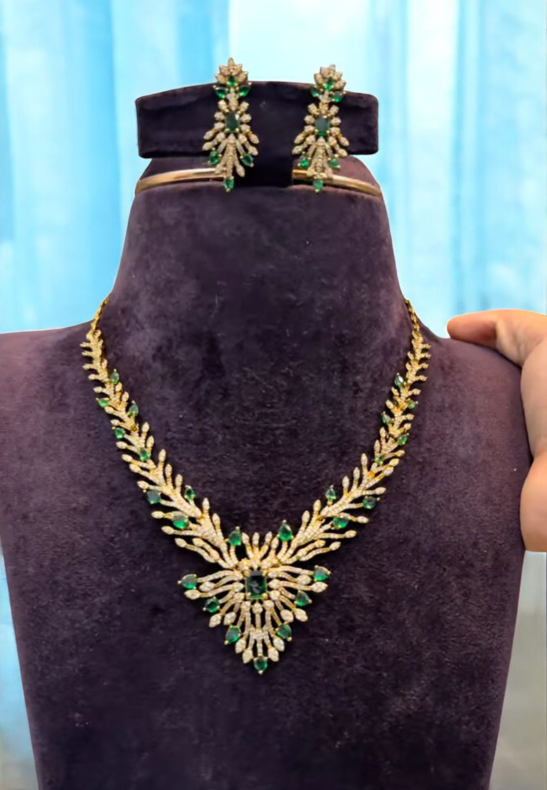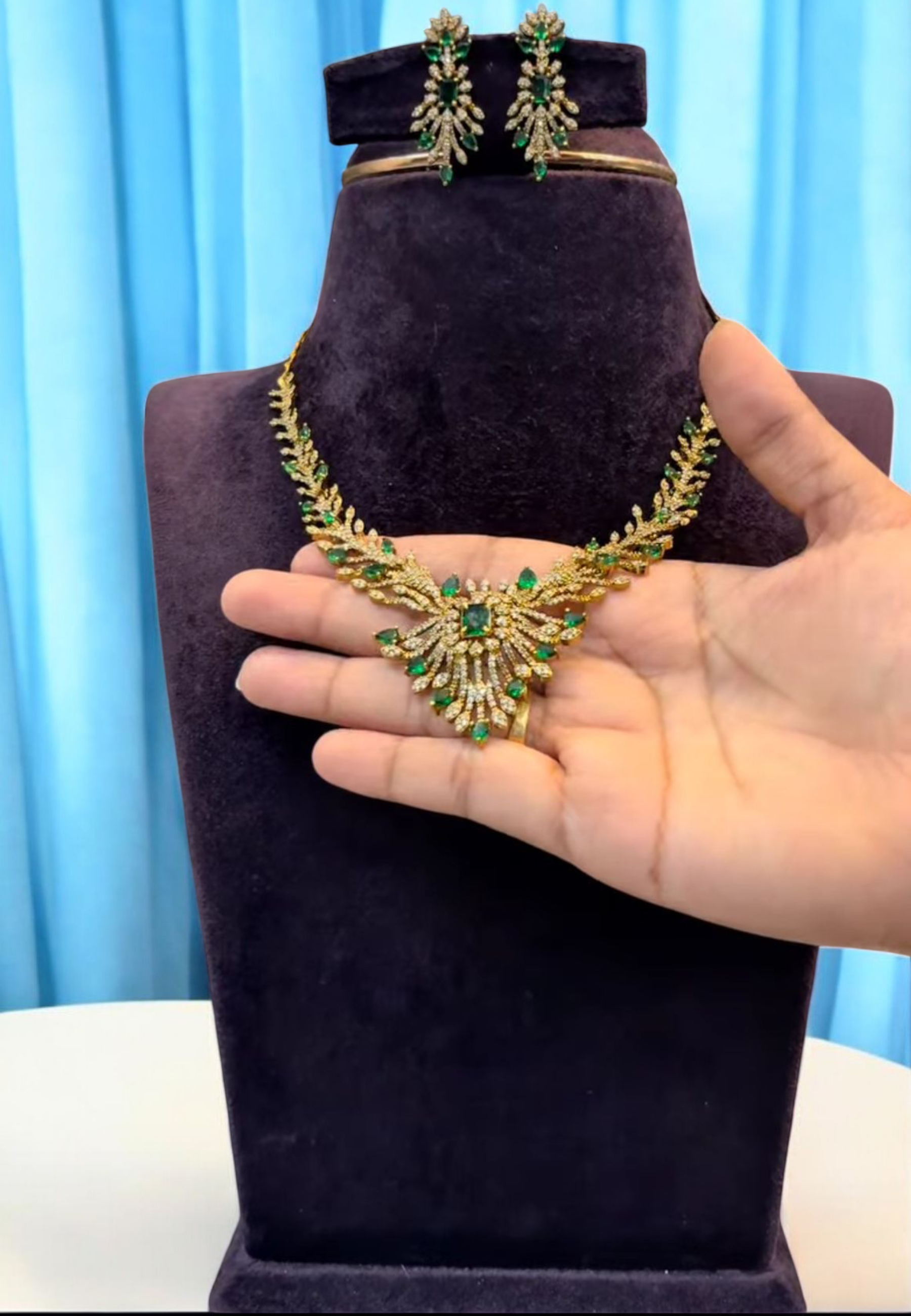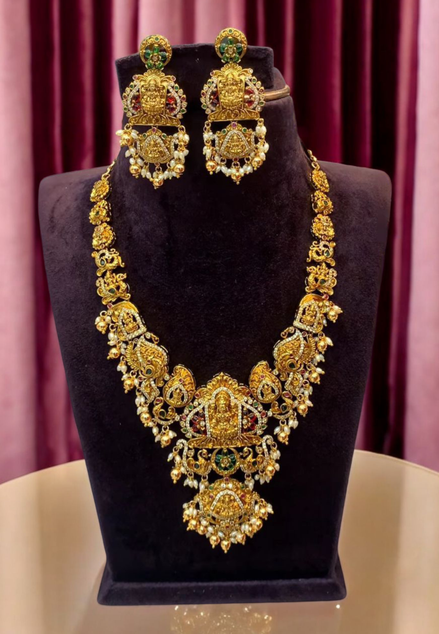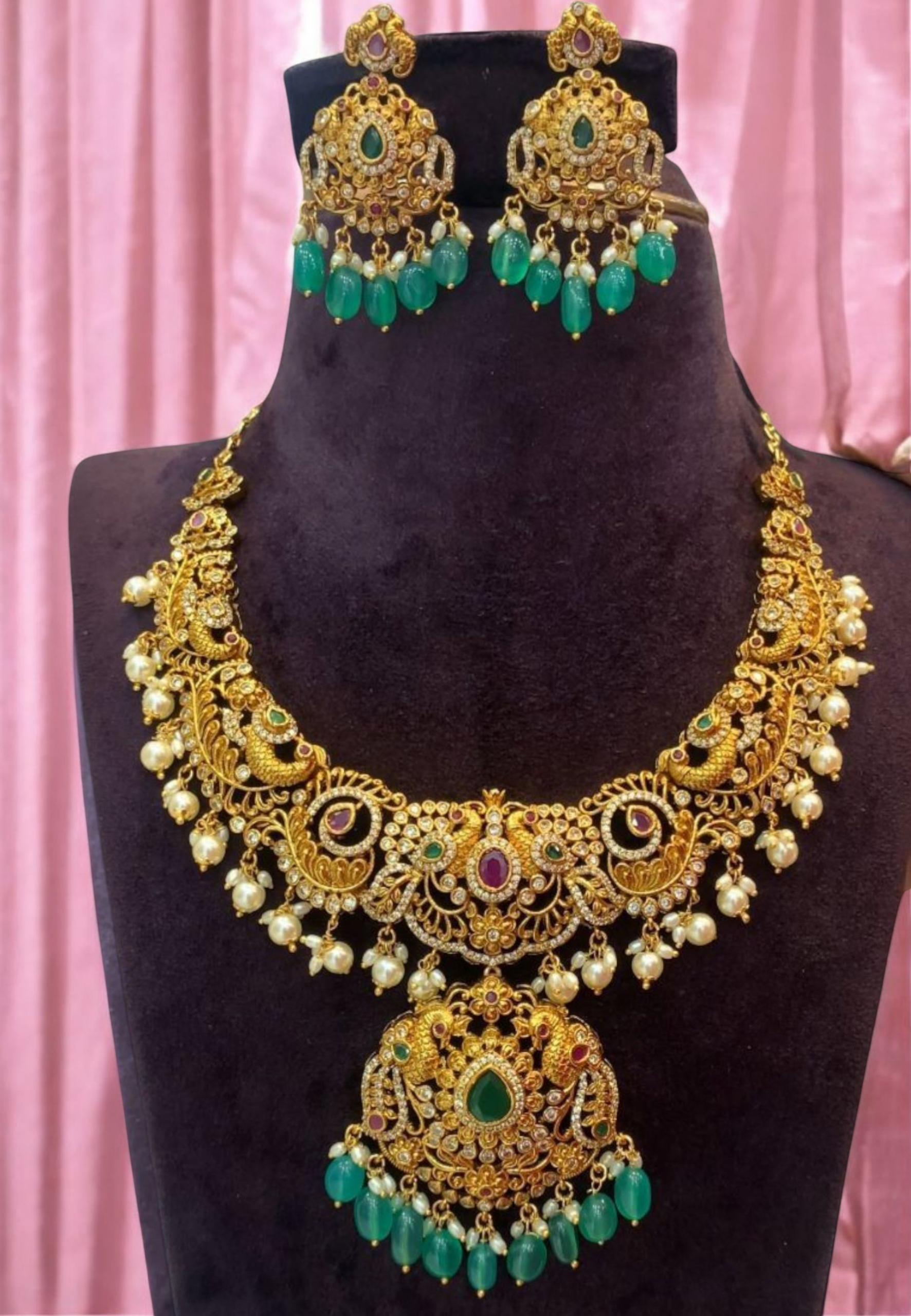 Beautiful short necklace with moissanite stones and nakshi finish with guttapusalu hangings